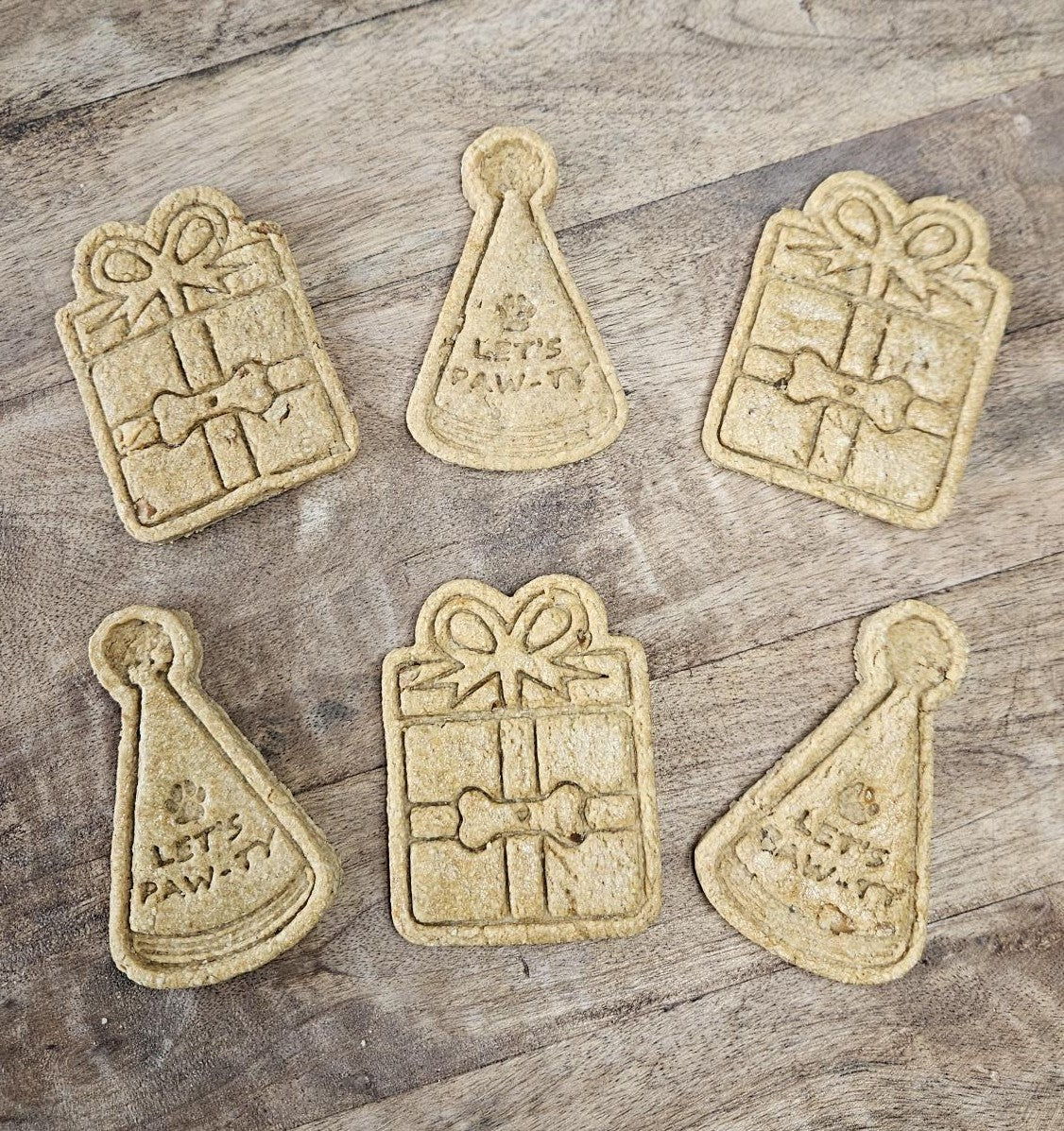 Our oven baked Whisk & Bark Birthday biscuits are the perfect gift or treat for your doggie's big celebration day! With paw-some birthday themed shapes, we use only the freshest human grade & dog safe ingredients in our kitchen so you can treat your pup without any guilt.